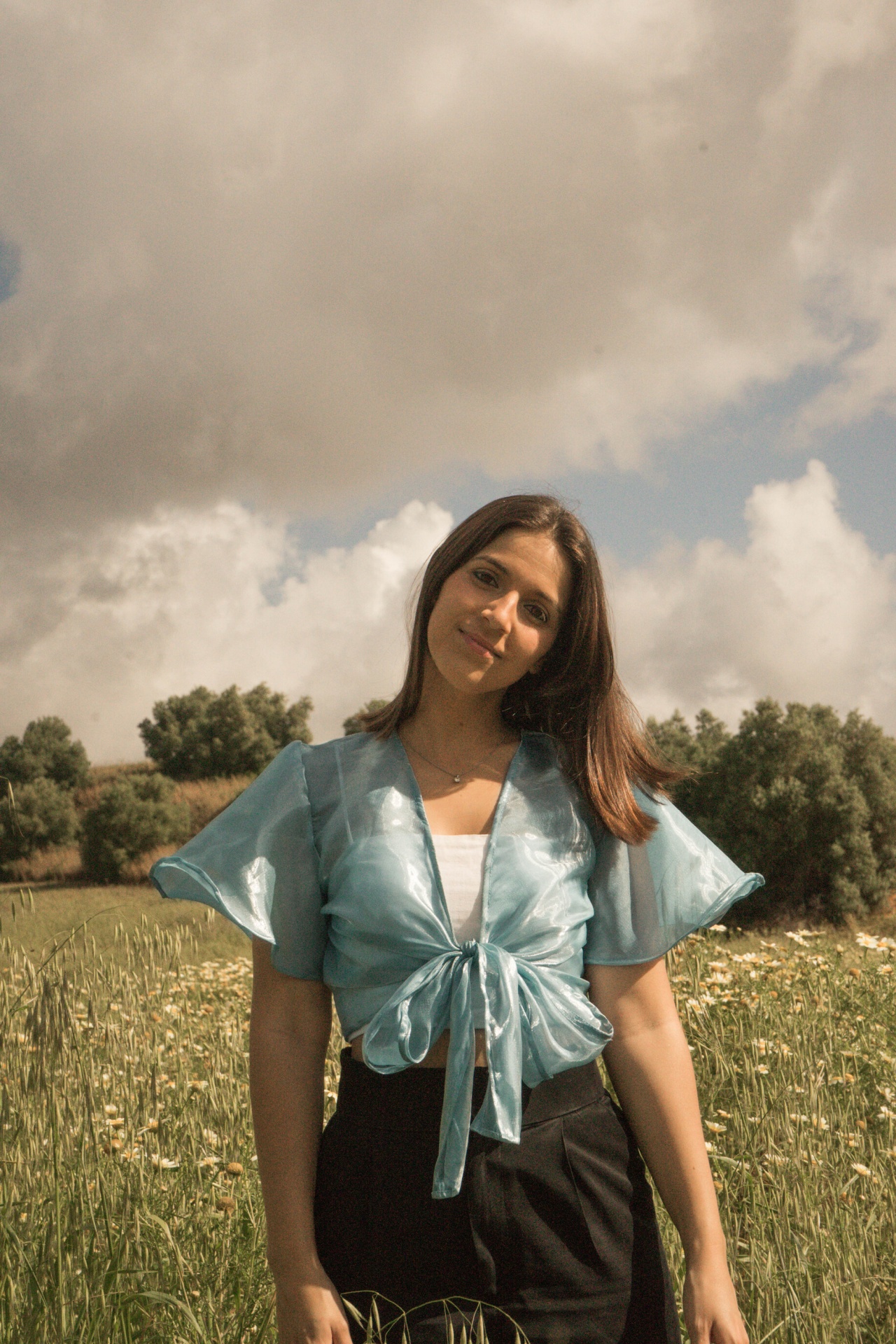 Ler maisTop de organza com pontas compridas. Opção de traçar ou dar laçada à frente.